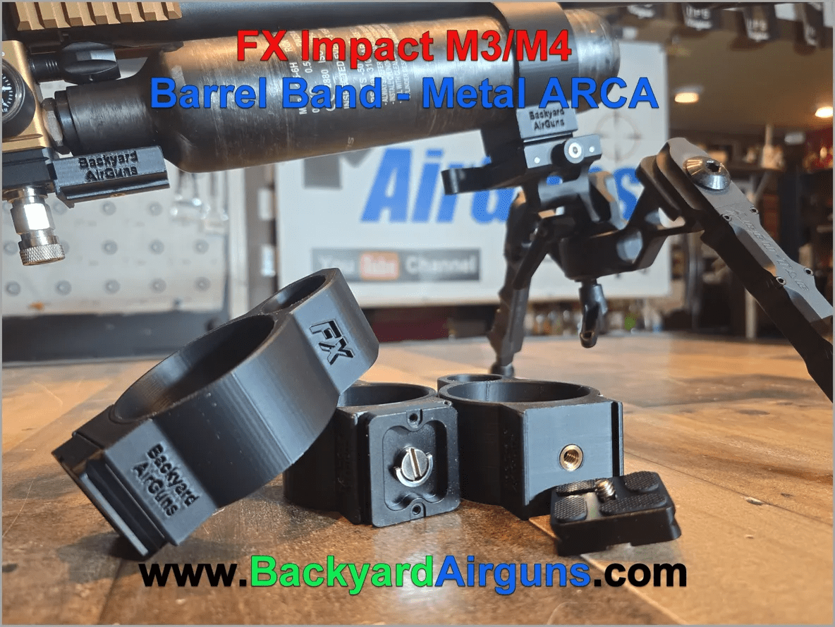 This FX custom barrel band is modified with metal ARCA rail that is attached by a 1/4 inch screws that is screwed into brass threads for strength. The ARCA band supports most any standard ARCA rail.